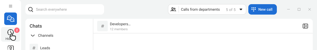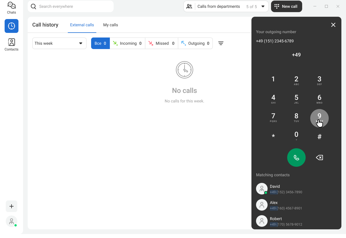 You can also make calls from other sections: from a contact card, the search bar, a chat with a colleague, or from the channel member list.
