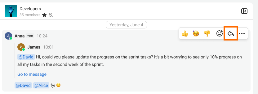We recommend using quotes during active channel discussions so that others can clearly see which message you are replying to. To do this, hover over the message and click the arrow on the right.