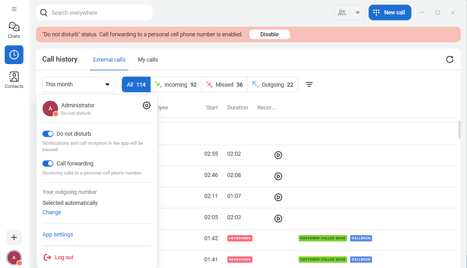 In the call history, you can learn more about a contact and quickly call them back. A flexible filtering system helps you find any call in the archive and listen to its recording if necessary.