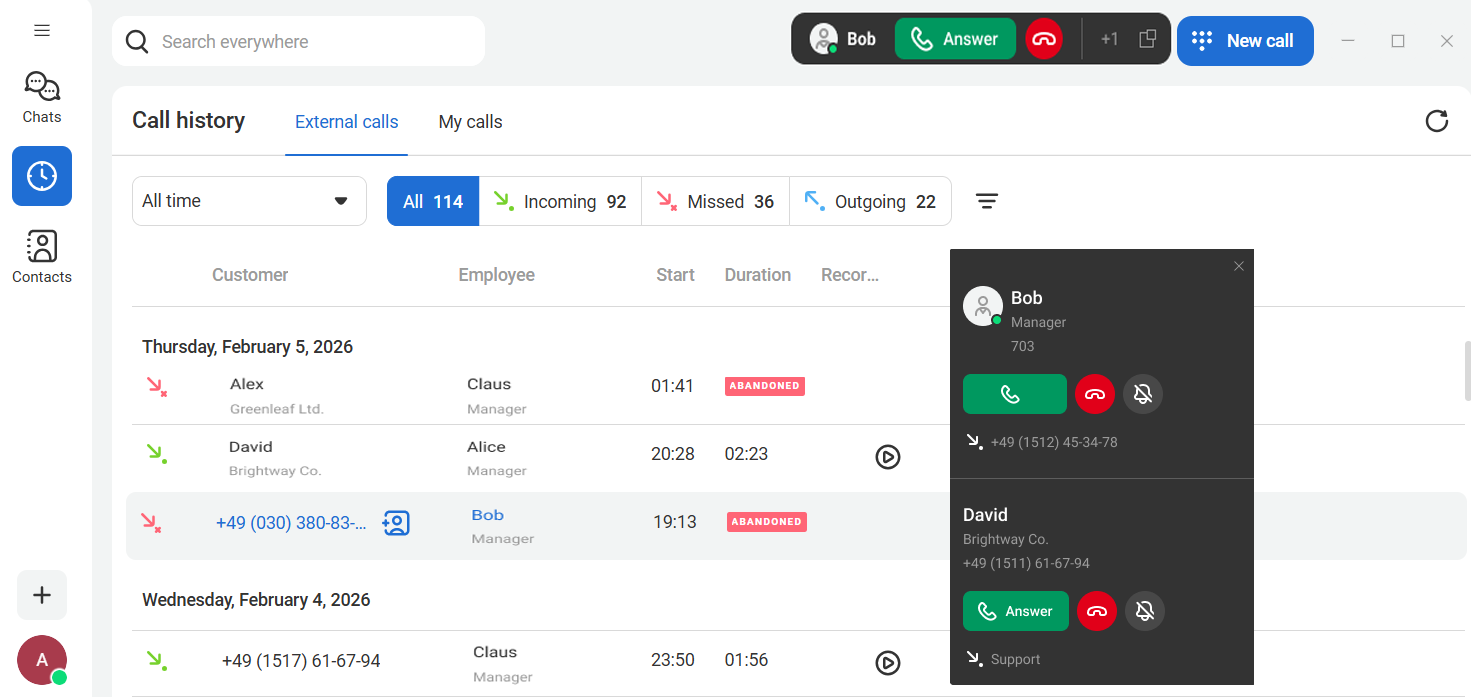 When a call comes in, a card pops up in the messenger with key contact details: the caller’s name, department, and the company number the call was made to. This helps you address the caller by name and quickly understand the context. To answer the call, click Answer.