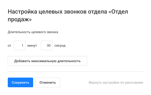 По умолчанию целевыми считаются звонки длительностью от 1 мин. 30 сек. Чтобы это изменить, нажмите на кнопку «Настроить целевые звонки».