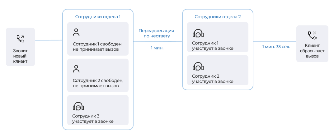 3. Сотрудник 1 не ответил. Через 30 секунд звонок был распределен на сотрудника 2.