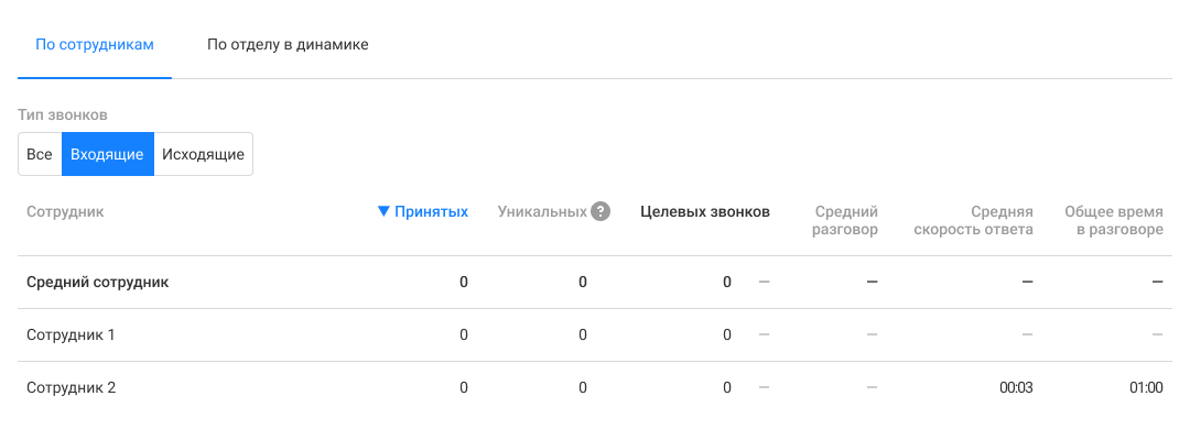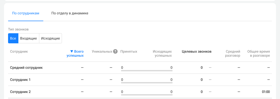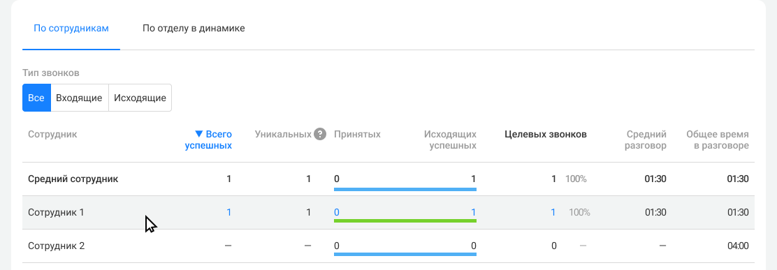Средний сотрудник. Показатели в этой строке считаются как среднее арифметическое по сотрудникам, у которых есть хотя бы один успешный звонок за выбранный период.