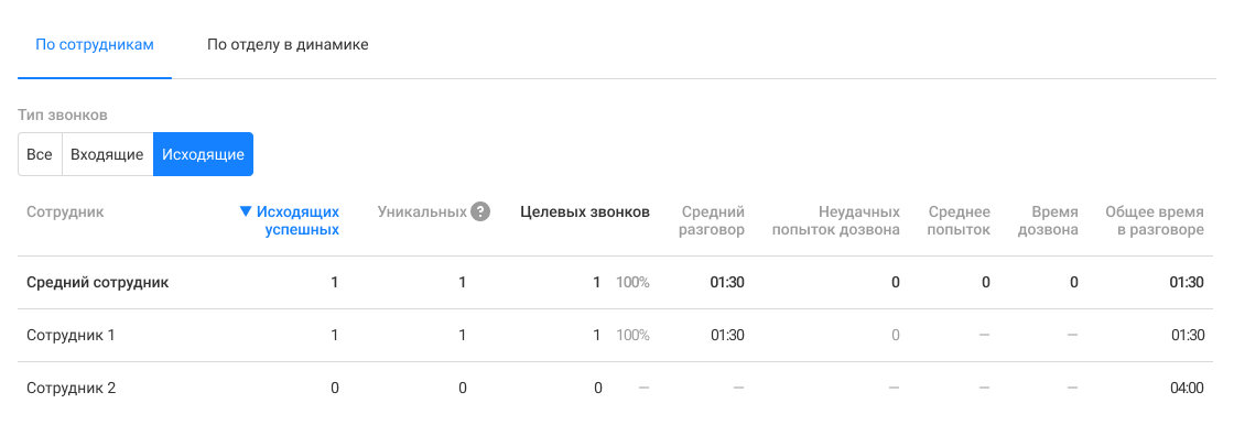 • Средний разговор и Общее время разговора — 1 мин. 30 сек. у первого сотрудника, так как это был единственный звонок за день. У второго сотрудника отображается только общее время в разговоре (4 мин.), так как средний разговор считается только по данным успешных звонков сотрудника.
