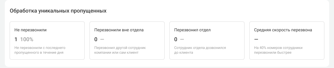 • Перезвонил отдел — количество и доля уникальных номеров среди пропущенных отделом, по которым состоялся успешный перезвон сотрудниками отдела.