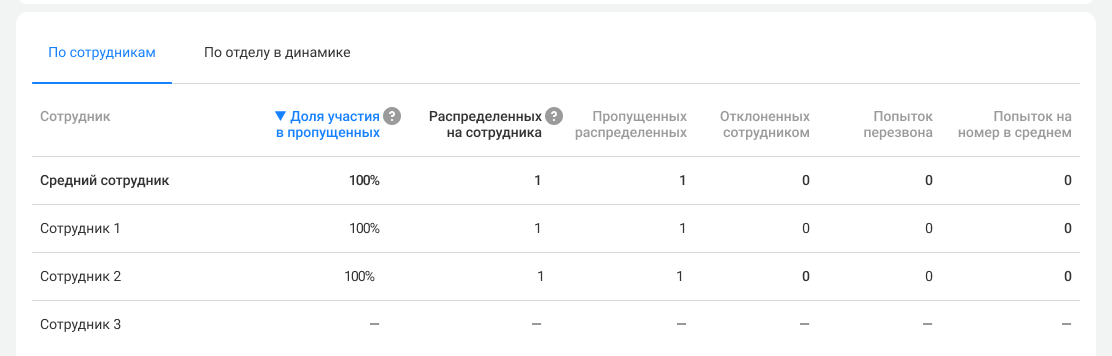 • Средний сотрудник. Показатели в этой строке считаются как среднее арифметическое по сотрудникам, у которых есть хотя бы один пропущенный звонок за выбранный период.