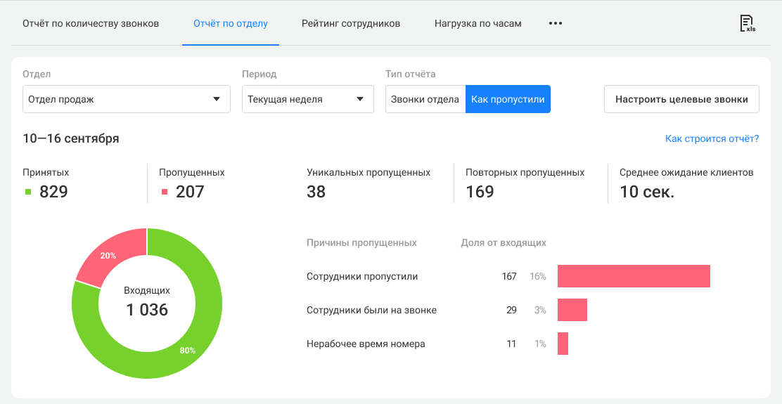- разбираться, почему звонки в отдел остались без ответа и кто из сотрудников чаще их пропускает.