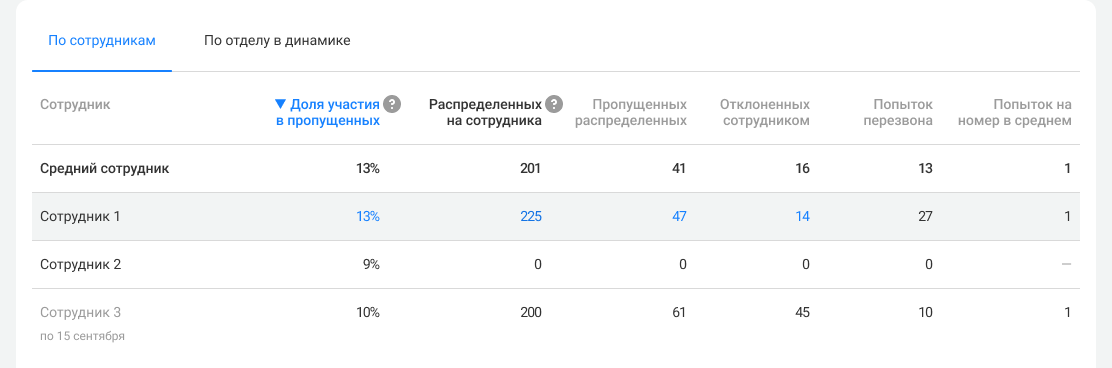 - Пропущенных звонков, распределенных на сотрудника — как часто сотрудник пропускает распределенные на него звонки. Возможно, доля участия в пропущенных отделом высокая, потому что таких звонков в целом немного, но при этом сотрудник редко пропускает звонки;