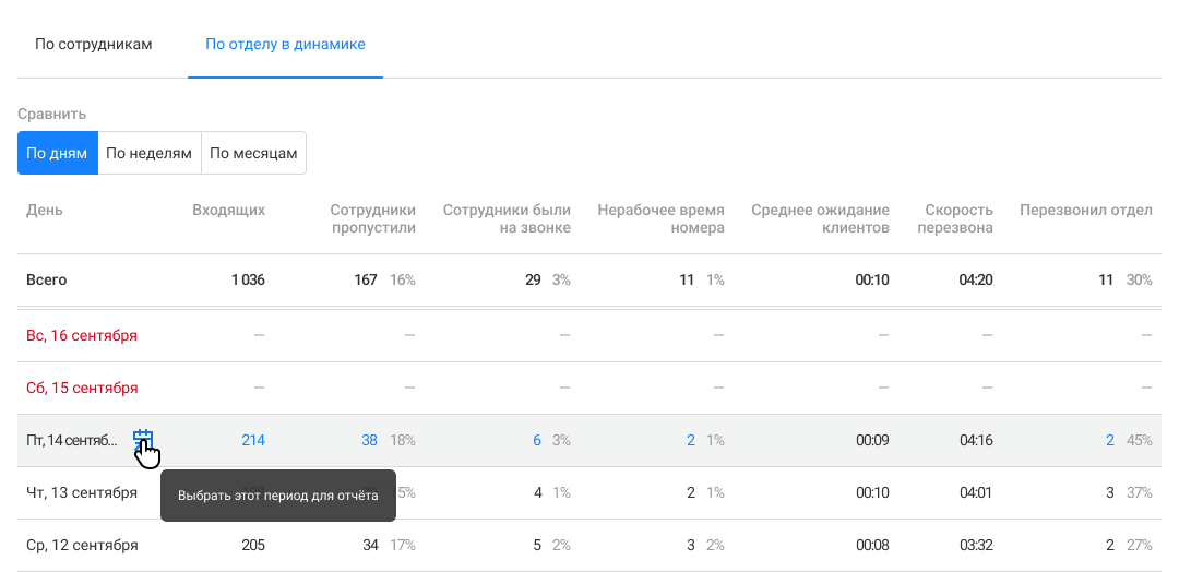 Таблица «По отделу в динамике» показывает, как меняются в течение времени основные из перечисленных выше показателей — улучшается или ухудшается ситуация по ожиданию клиентов и пропущенным звонкам, а также по их обработке.