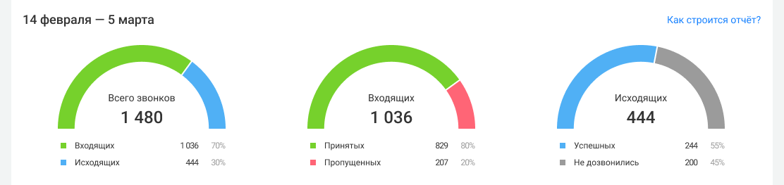 • сколько всего звонков состоялось — число и доля входящих и исходящих в отделе за выбранный период, какими звонками отдел больше загружен;
