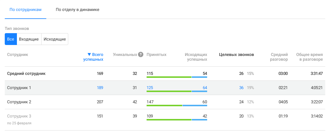 Для оценки вклада каждого сотрудника в результаты отдела используйте таблицу по звонкам сотрудников: по всем вызовам или отдельно по входящим и исходящим.