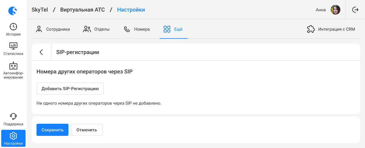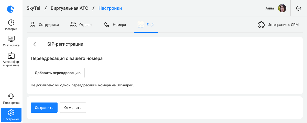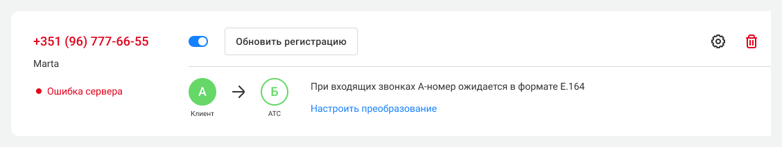 Также в настройках номера будет раздел «При входящих звонках А-номер ожидается в формате E.164». Это техническая информация и, чаще всего, сюда вносить изменения не требуется. Если ваш оператор связи работает не по стандарту E.164, здесь вы сможете настроить преобразование.